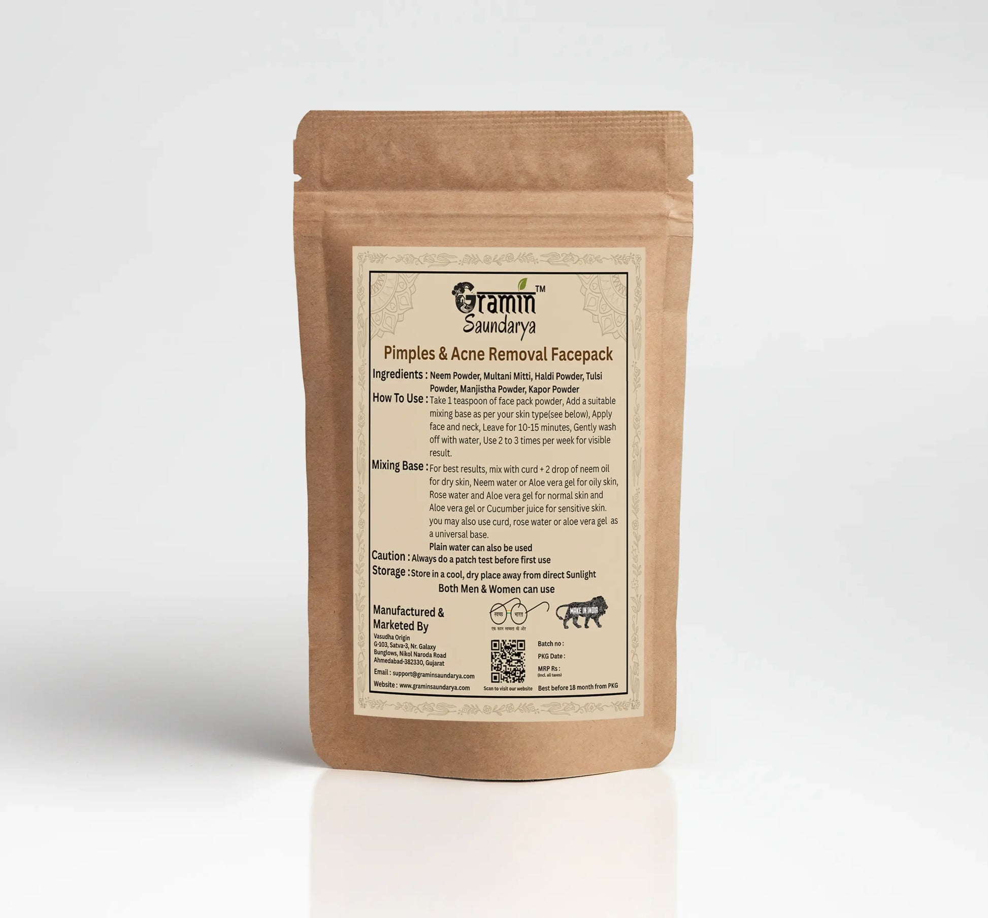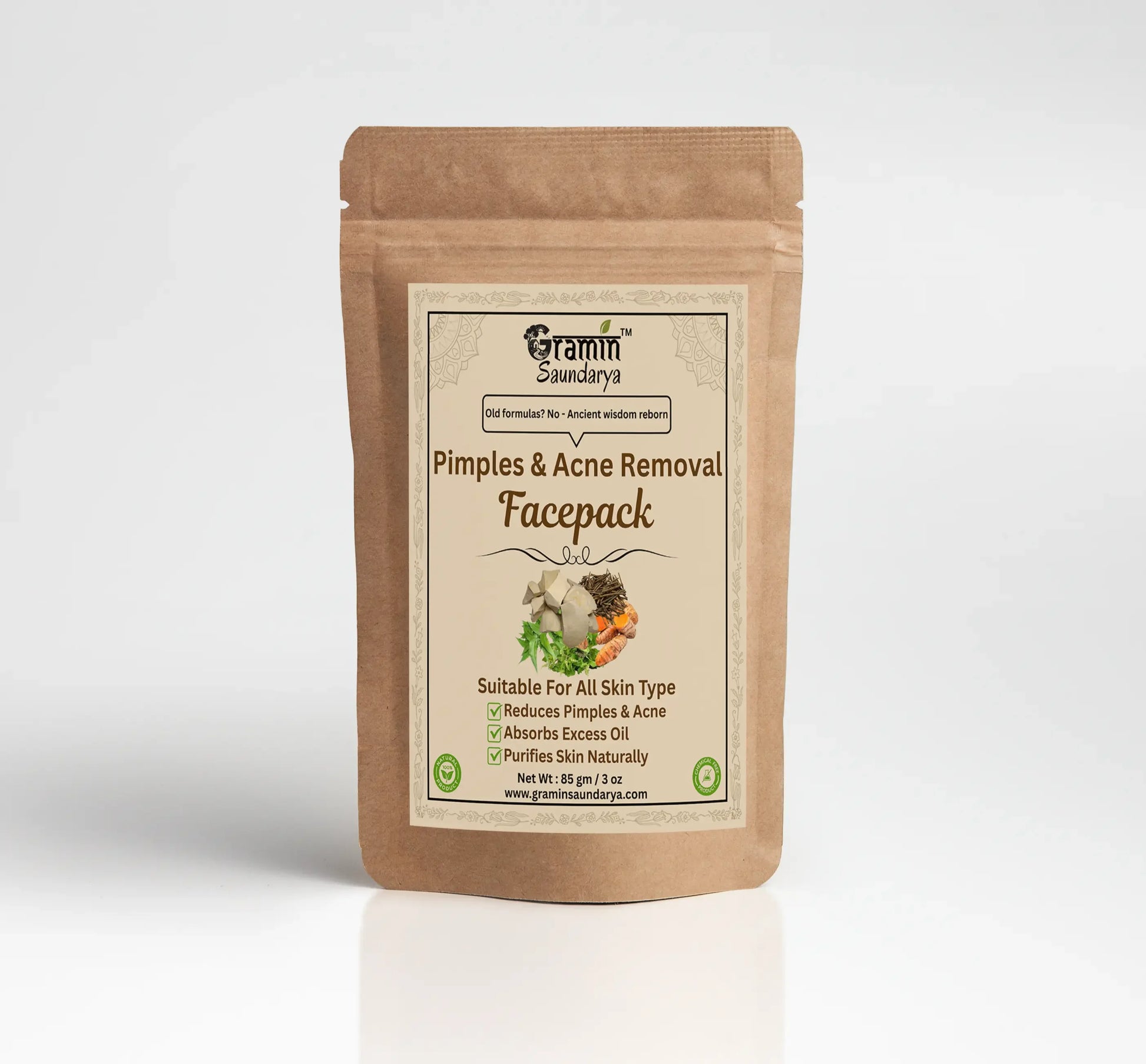 Banish breakouts naturally with Gramin Saundarya’s Pimples & Acne Removal Face Pack, an Ayurvedic blend of powerful herbs that fight acne, reduce excess oil, and calm inflammation. Specially formulated to keep your skin clear, healthy, and balanced—without any harsh chemicals.